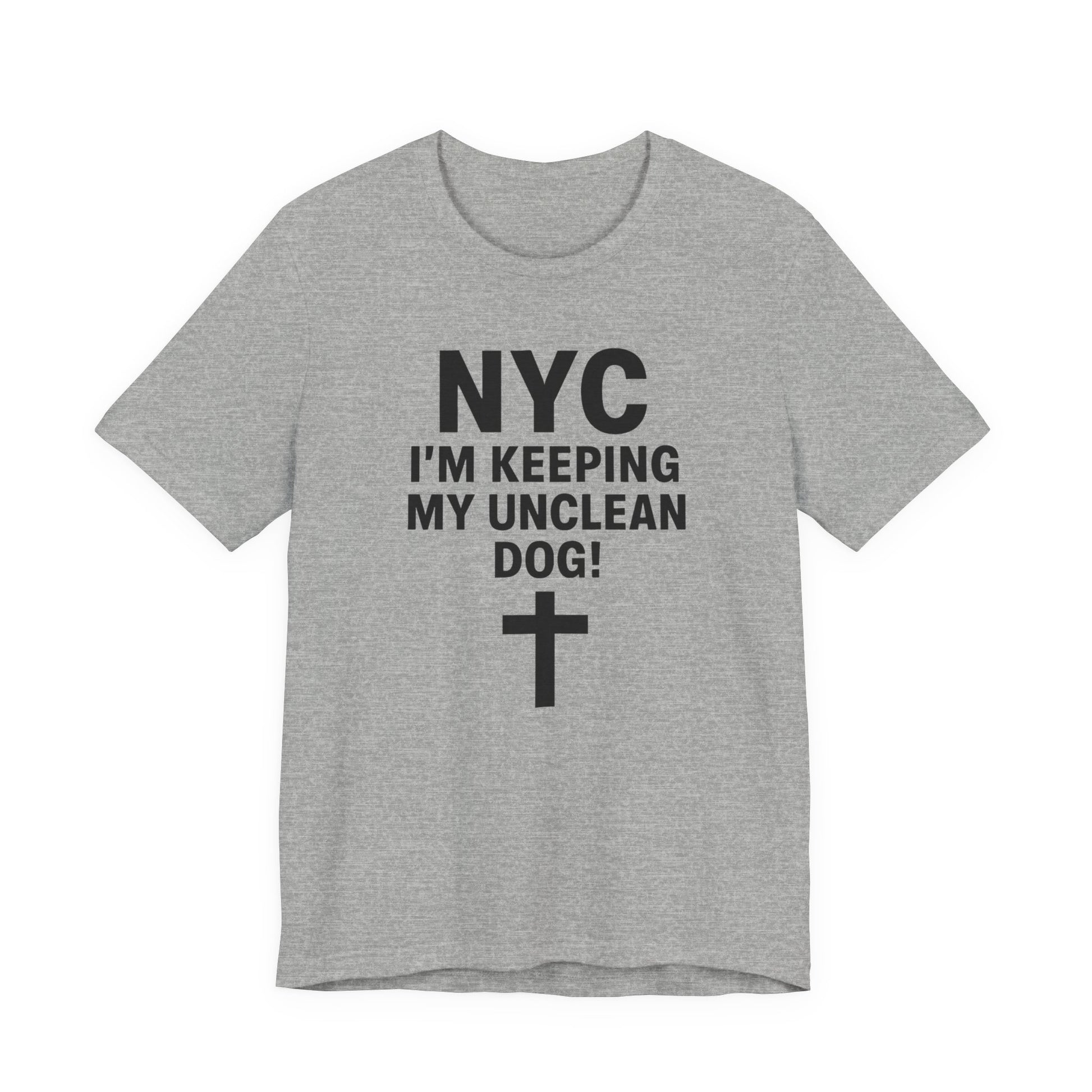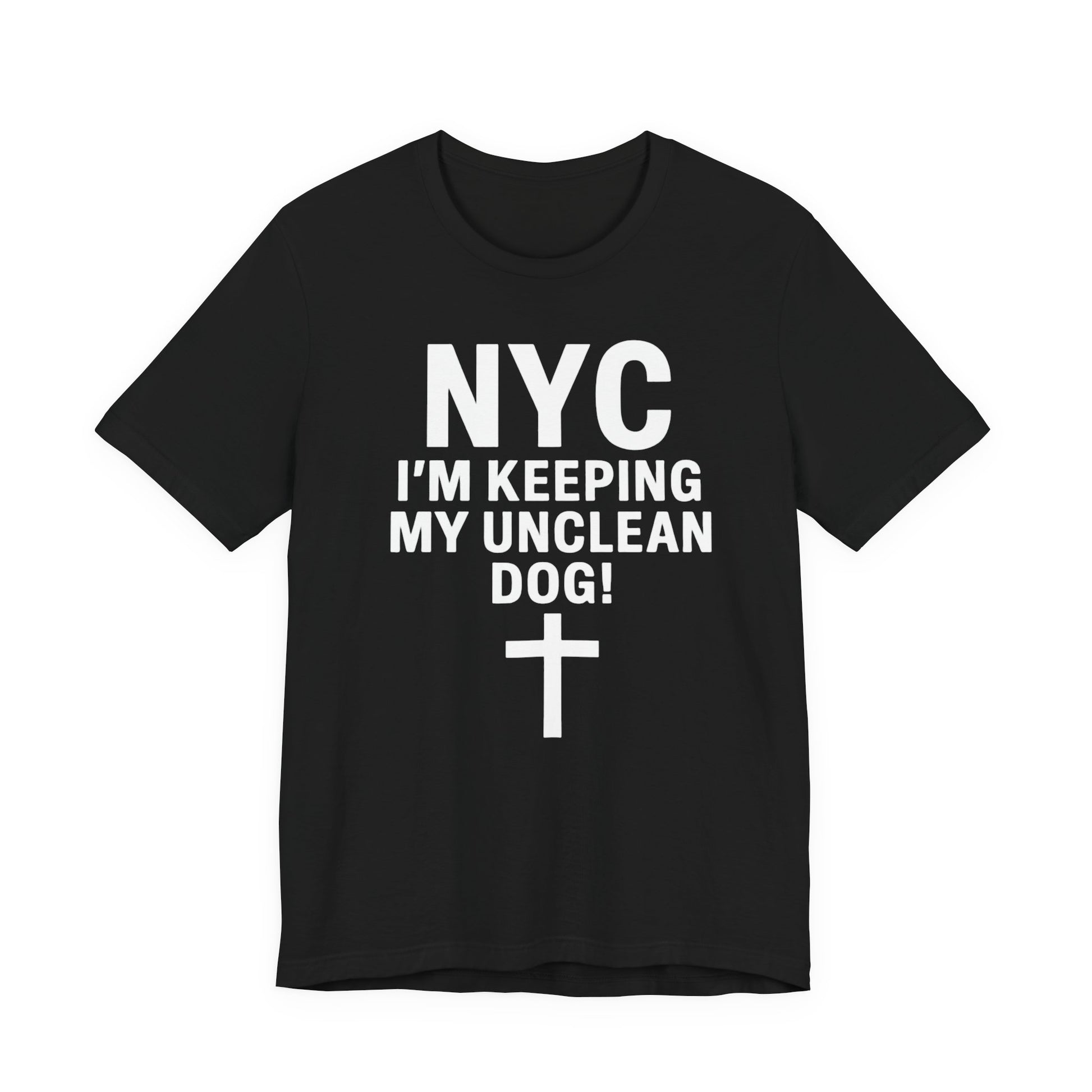 This lightweight, breathable jersey tee carries a bold, tongue-in-cheek statement for city dwellers with attitude. The front features strong, blocky lettering reading “NYC I’M KEEPING MY UNCLEAN DOG!” above a simple cross-style graphic. Worn alone or layered under a denim jacket, it brings a casual, ironic energy to everyday routines — from morning coffee runs to late-night walks through neighborhood streets. The soft Airlume combed and ring-spun cotton feels gentle on skin while the retail crew cut keeps the silhouette tidy and easy to accessorize. It’s made to move with the wearer: side seams and shoulder tape hold shape, ribbed collar stays resilient, and a tear-away label avoids irritation. Sourced and produced with an emphasis on ethical manufacturing, this tee sits comfortably in both urban wardrobes and relaxed weekend looks.